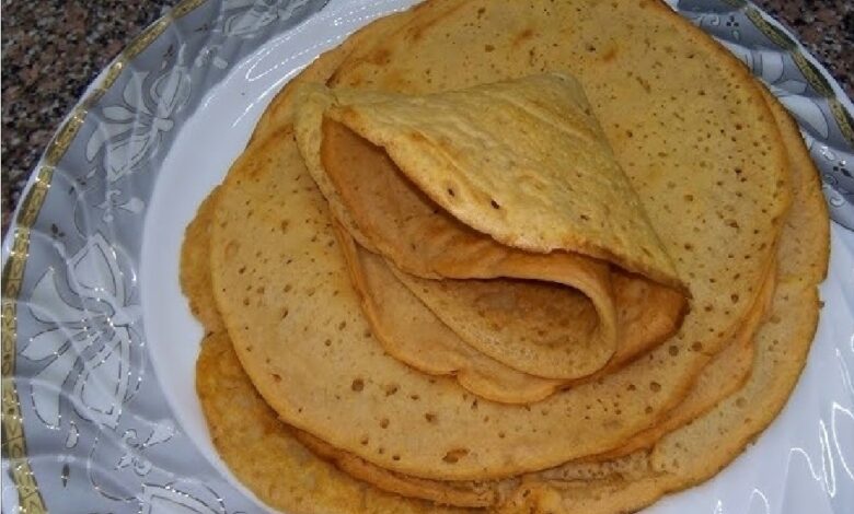 5  –  نسخن مقلاة مدهونة بالزيت على الحرارة ونضع فيها مقدار ملعقتين كبيرة من العجينة.