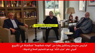 الرئيس سليمان يستقبل وفدًا من “الوفاء للمقاومة” للمشاركة في تشييع أميني عام “حزب الله” ويدعو لتسليم السلاح للدولة.