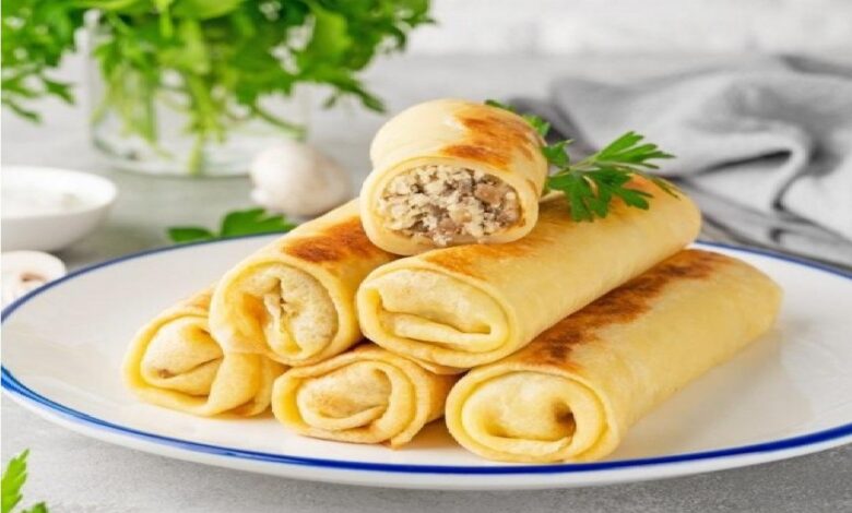نضع مقدارًا من الحشوة داخل كل بان كيك ونلفّه رول أو نطويه نصفين.