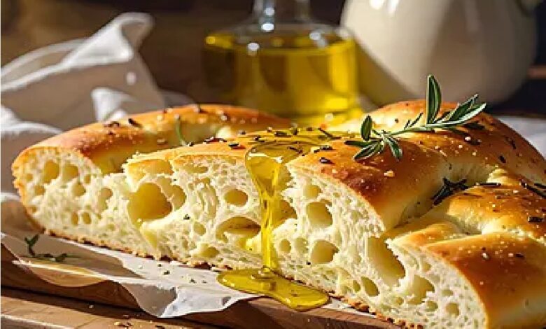 6️⃣ وزعي زيت الزيتون على الوجه بسخاء، ثم رشي الأعشاب والملح الخشن، وأضيفي الزيتون أو الطماطم إن رغبتِ.