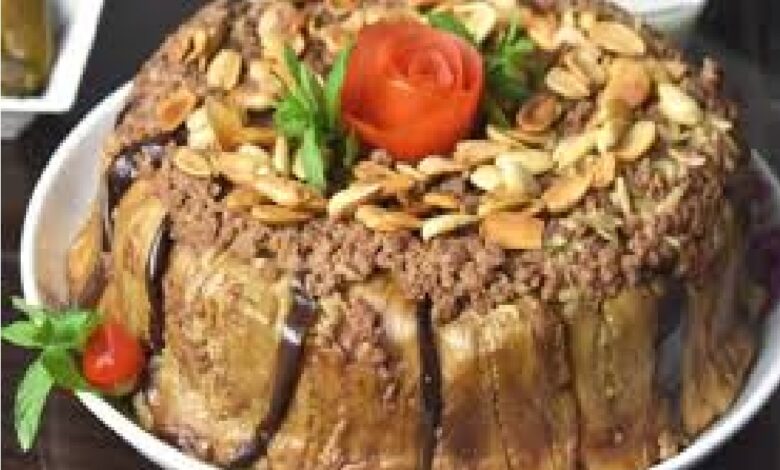طبق تقليدي غني بالنكهات، يجمع بين طراوة اللحم والباذنجان المقلي مع الأرز المتبل—ويُقدَّم بطريقة مبهرة عند قلبه!