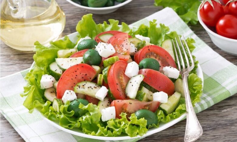 3 – توضع الطماطم في بولة ويضاف إليها الخيار والجبنة وتخلط جيداً.